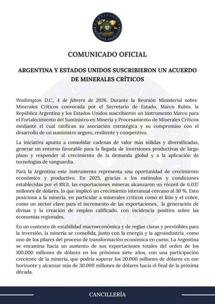 Según informó la Cancillería argentina, el entendimiento ratifica la asociación estratégica bilateral y el compromiso compartido con «el desarrollo de un suministro seguro, resiliente y competitivo». El acuerdo fue rubricado en el marco de una reunión ministerial sobre minerales críticos convocada en Estados Unidos por el secretario de Estado, Marco Rubio, donde se avanzó en lineamientos comunes para fortalecer las cadenas de abastecimiento.
