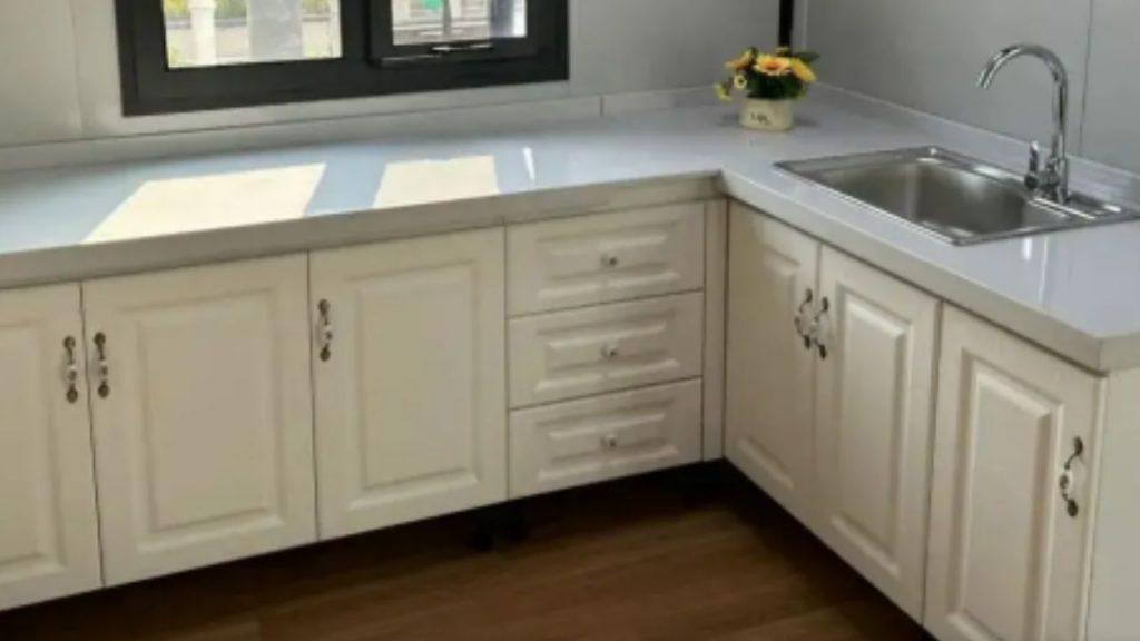 La planta baja funciona como un espacio integrado para living y cocina comedor, con pisos de fibrocemento de 16 mm y revestimiento PVC de 1,6 mm, lo que garantiza durabilidad y un acabado moderno. También incluye un mueble bajo mesada de 2,40 m, paneles decorativos y un falso techo de aluminio que refuerza su estética premium.