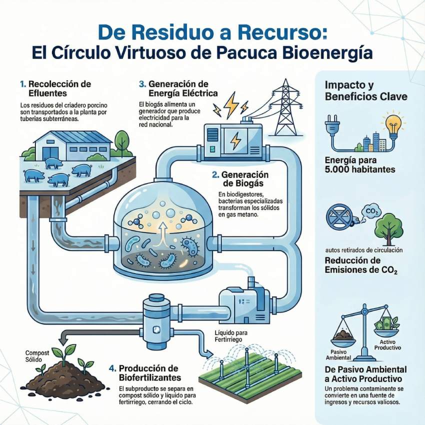 La planta funciona a partir de efluentes de unos 50.000 cerdos, que alimentan tres biodigestores de tecnología europea. El proceso permite transformar un residuo ambientalmente problemático en biogás y, luego, en electricidad que se inyecta al sistema interconectado nacional.