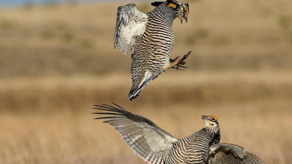 Entre los seleccionados de este año se encuentra la fotografía de Peter Hudson, de la Universidad Estatal de Pensilvania (Estados Unidos), quien capturó un combate aéreo entre dos gallos de las praderas machos (Tympanuchus cupido) en Colorado. En estos rituales de cortejo, los ejemplares saltan y chocan en pleno vuelo para imponer su dominio.